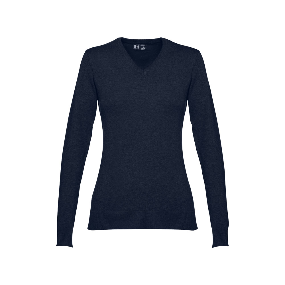 Pullover com decote em “V” para senhora em 70% algodão e 30% poliamida (220 g/m²). Contém gola, punhos e parte inferior em Rib. Mangas inseridas com fully-fashion. Tamanhos: S, M, L, XL, XXL