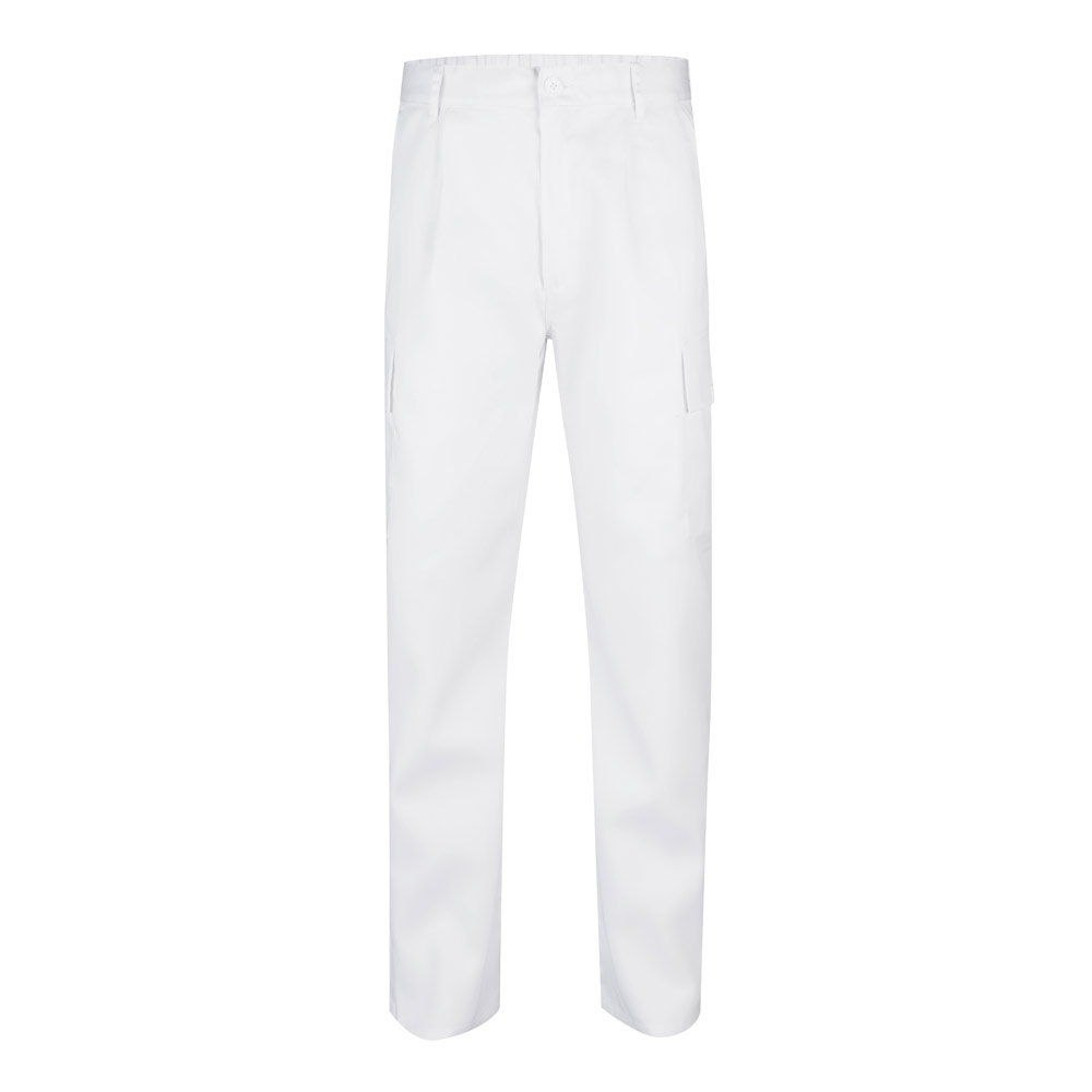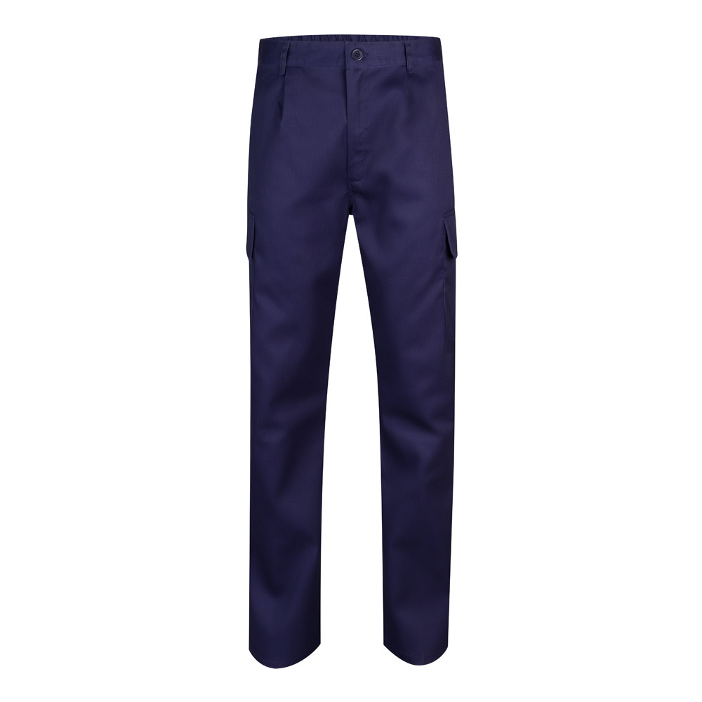 Calças em sarja (190g/m²) multibolsos, em algodão (20%) e poliéster (80%). Com cós elástico e cinco bolsos (2 bolsos franceses, 2 bolsos fole laterais e 2 bolsos fole traseiros). Tamanho: 36, 38, 40, 42, 44, 46, 48, 50, 52, 54, 56, 58, 60